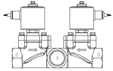 二進一出 1:當(dāng)電磁閥線圈同時通電時,2通向1,3與1關閉(bì)。